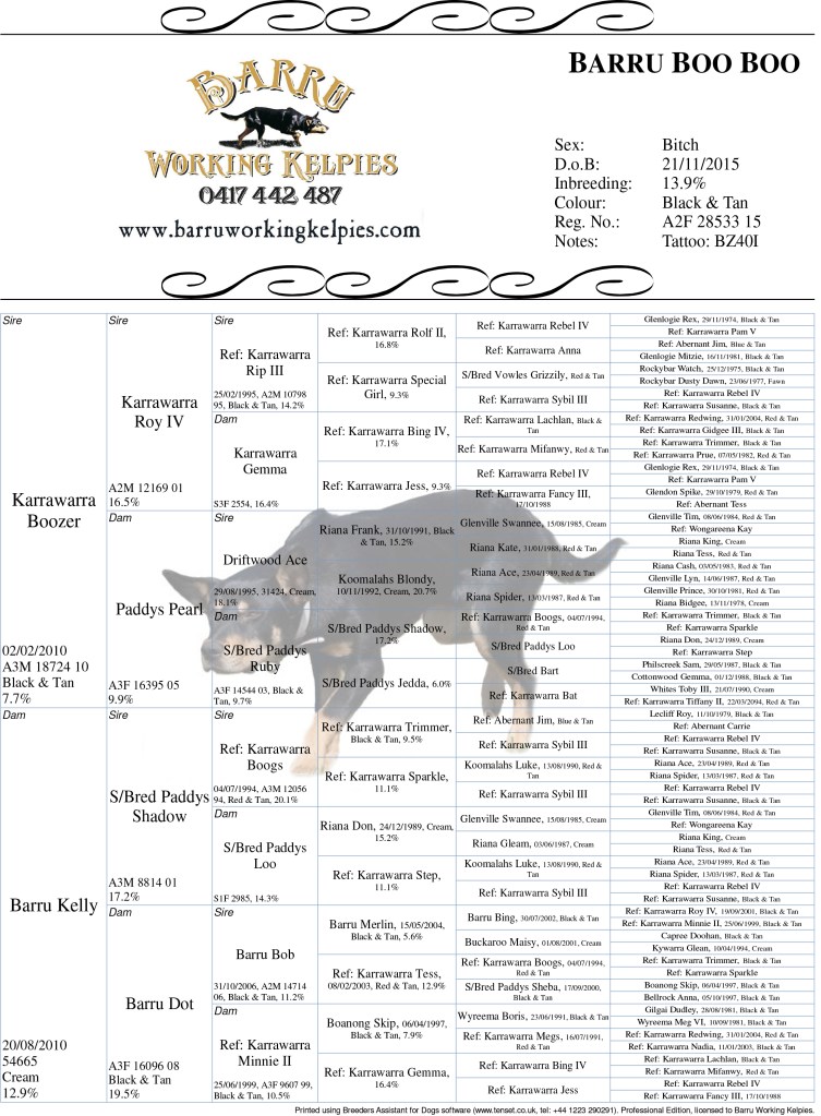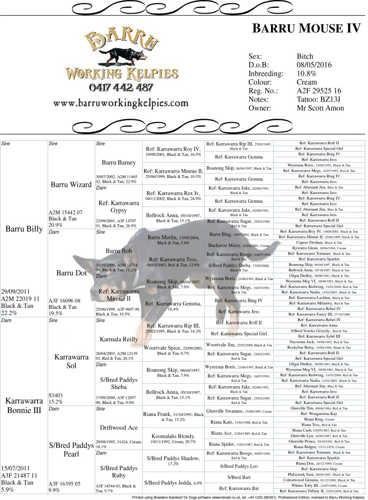 Mouse is one of the sweetest natured and ‘die for you’ dogs that we have ever had. She is an intense worker that controls a mob with limited to no command and assertive, yet responsible. Her work would be as ‘correct’ as we have seen in a dog. She has shown some real strength on cattle and will revert to sheep work and adjust her work immediately. She has proven an exceptional breeder and is nearing the end of her reproductive contribution to Barru and other studs.