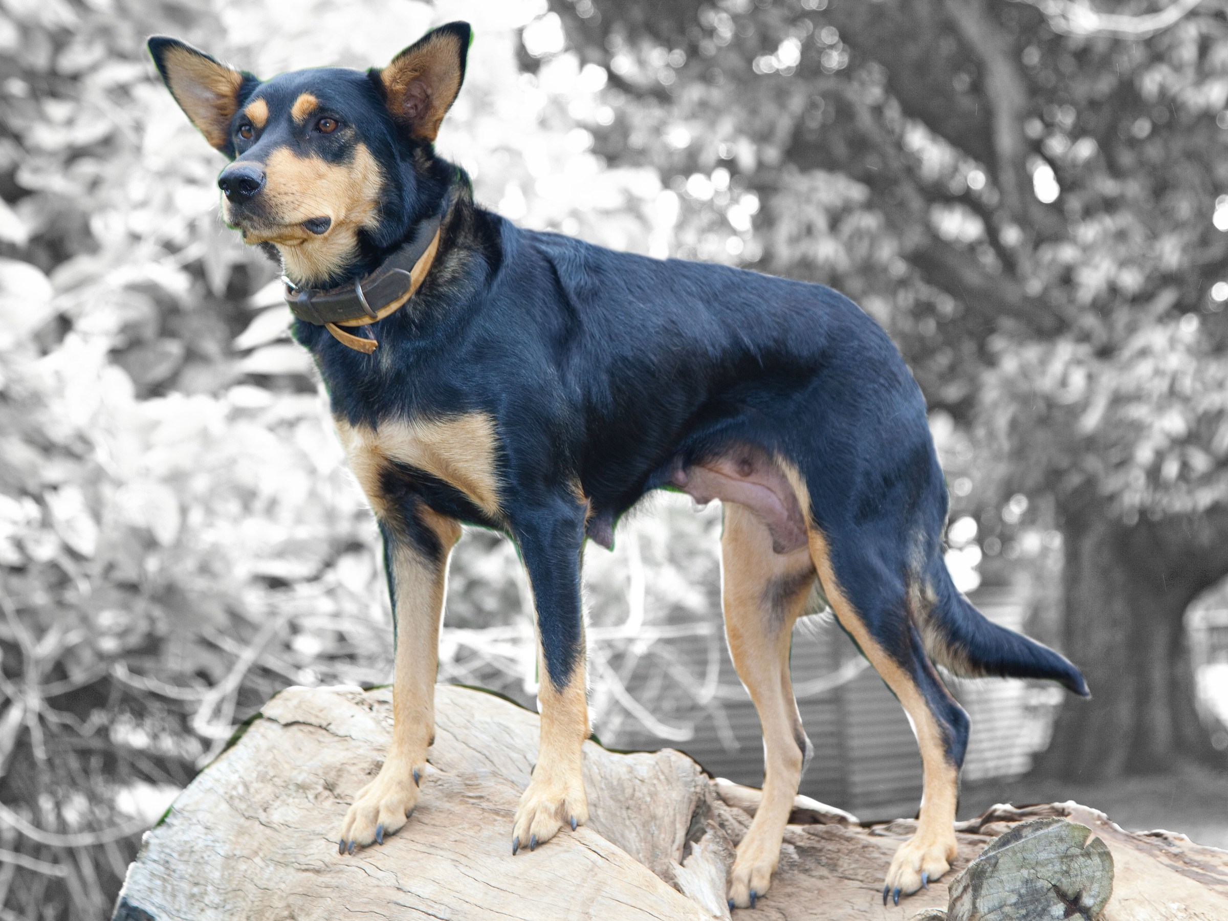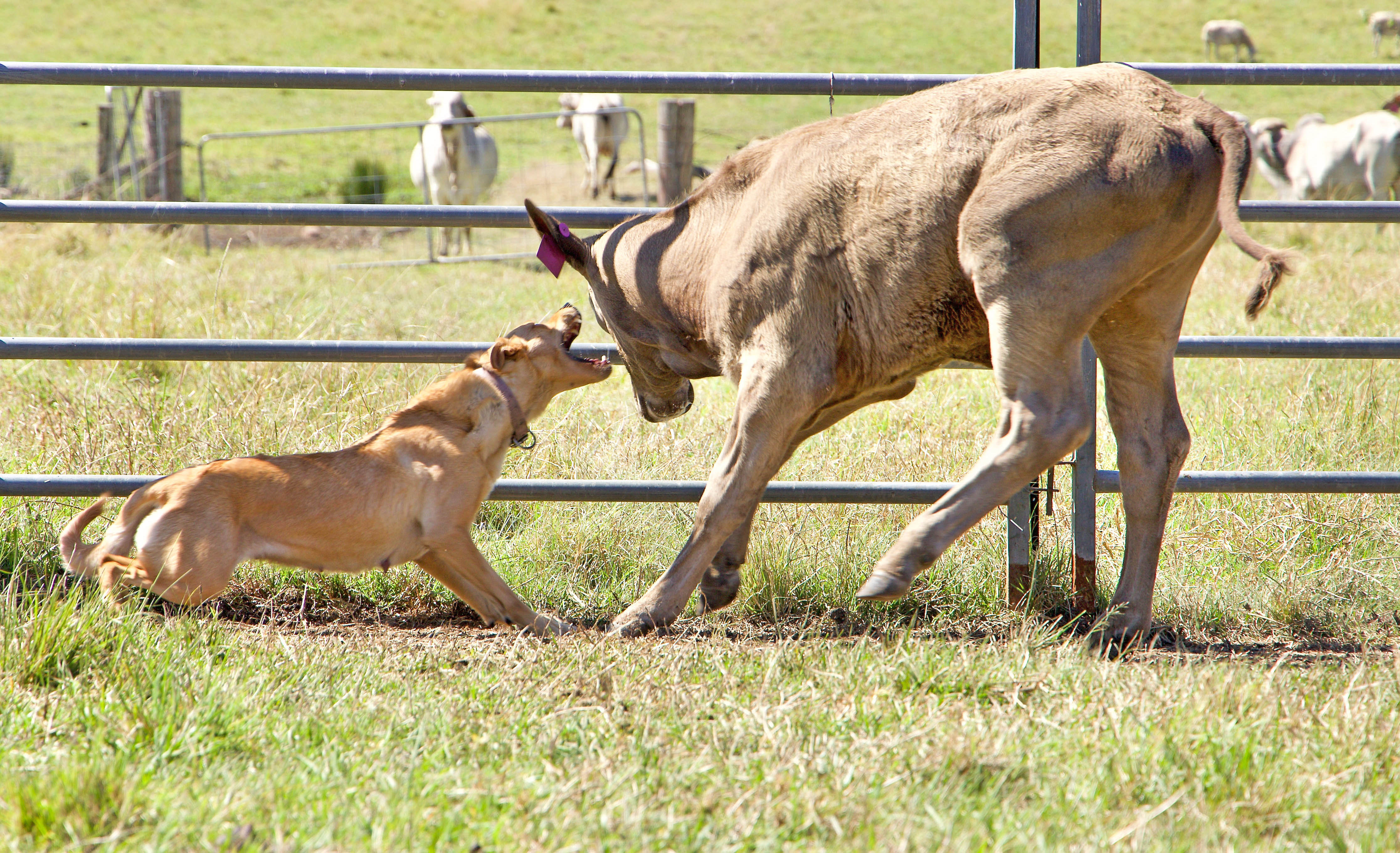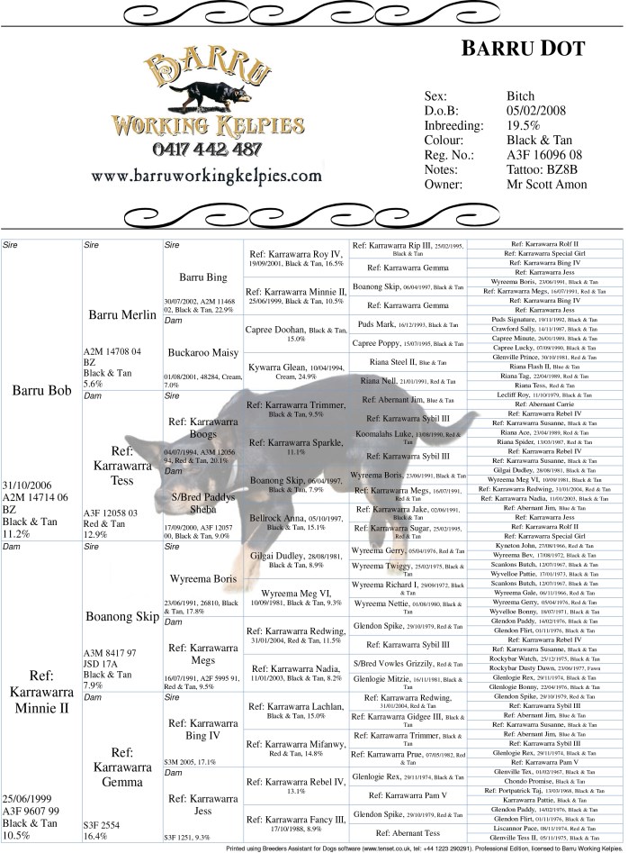 Dot is an extremely faithful black and tan bitch of excellent type both in nature and build. She is impressive moving and stylish in her work on cattle and sheep. She has tremendous cast and natural feel and balance on her stock. She is one of the toughest dogs we have ever had. Fearless on cattle, but calm. Will not hesitate to put her life on the line to hold ground. While being tough and strong she can handle touchy sheep with ease and will calmly take body blows from a ewe with lamb at foot, and stay with it until she has it back with the mob. She has proven a very good brood bitch, particularly when you skip a generation. We are now just starting to produce a few double crosses of her and the progeny are outstandingly calm, strong and correct. A couple of her better known direct progeny are Barru Monkey (successfully trialled and used widely as a sire by Joe Spicer of the Gogetta stud) and Barru Billy who worked in Griffith sale yards and contract working for Chris Johnson. Chris, not a man to mince his words, reckoned Billy was one heck of a tough dog.