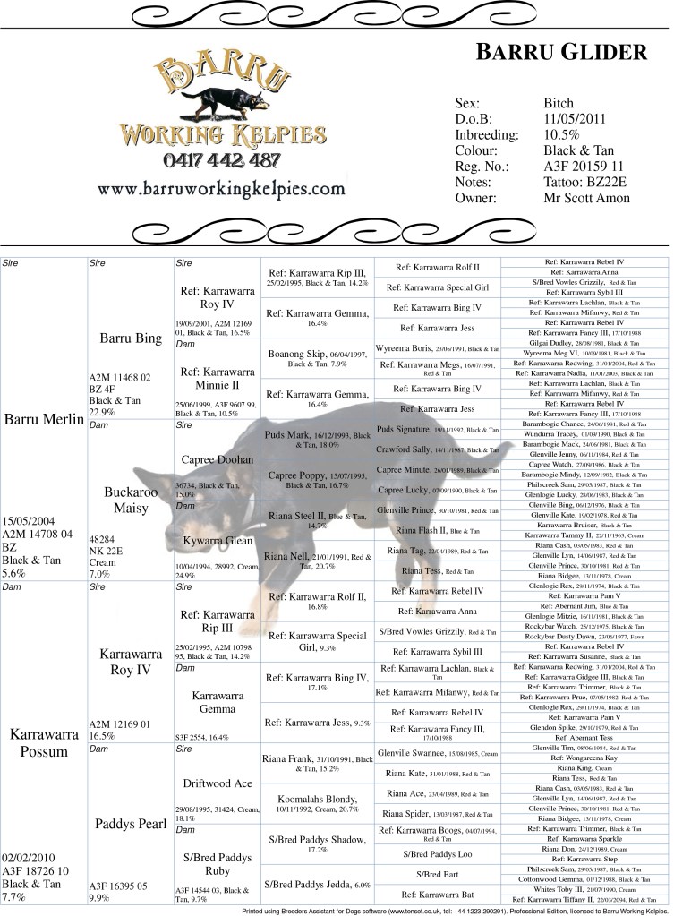 Minnie is a foundation bitch of the Barru stud and you will find either her or her parentage in virtually all Barru dogs. She was a lovely medium build type, loaded with work and ever-keen to work any stock. She was a very correct bitch shepherding wise and had a wonderful compliant and very sound temperament. A number of influential people made offers to buy her, but she never left Barru. She was taken back to Karrawarra sires and to outside sires – the former delivering great success. Her mother, Gemma, was a proven station bitch on a big Queensland run working large numbers of sheep and goats. Her father Skip was out of the exceptional brood bitch that James Dudley had, Karrawarra Megs. To have had the opportunity to kick off Baru with such a great bitch was a blessing that we cannot thank Tony Parsons enough for.
