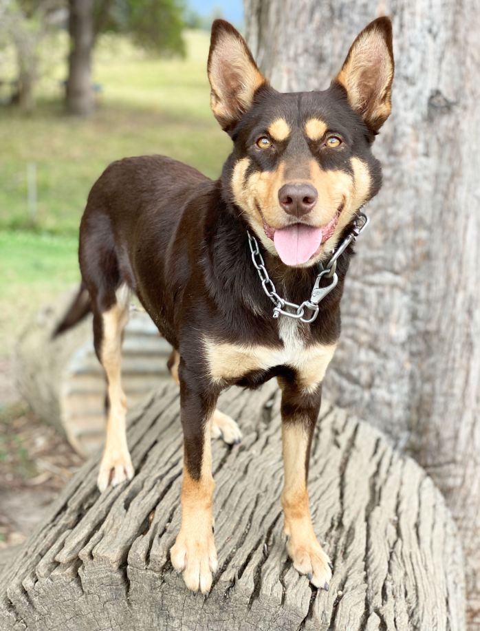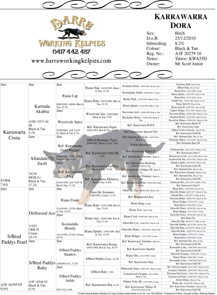 Possum is a superb looking long-bodied bitch that covers the ground with grace and ease. She is naturally very correct in her work and has been since she first went around her stock as a young pup. She is a full litter sister to our great sire Karrawarra Boozer. Possum has only been trialled a few times, but won the maiden event at her first ever cattle trial at Macksville, NSW. She is a very compliant and special bitch to have around. Her progeny are doing general stock work all over the country as well as regularly taking out ribbons at sheep and cattle trials.
