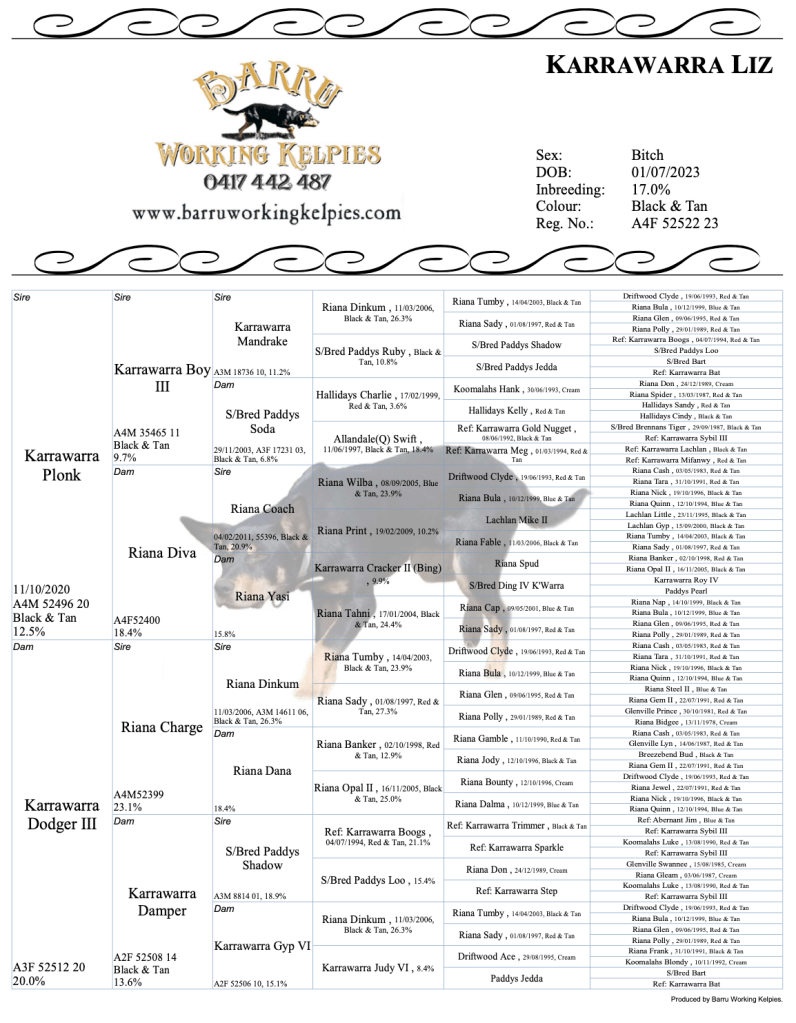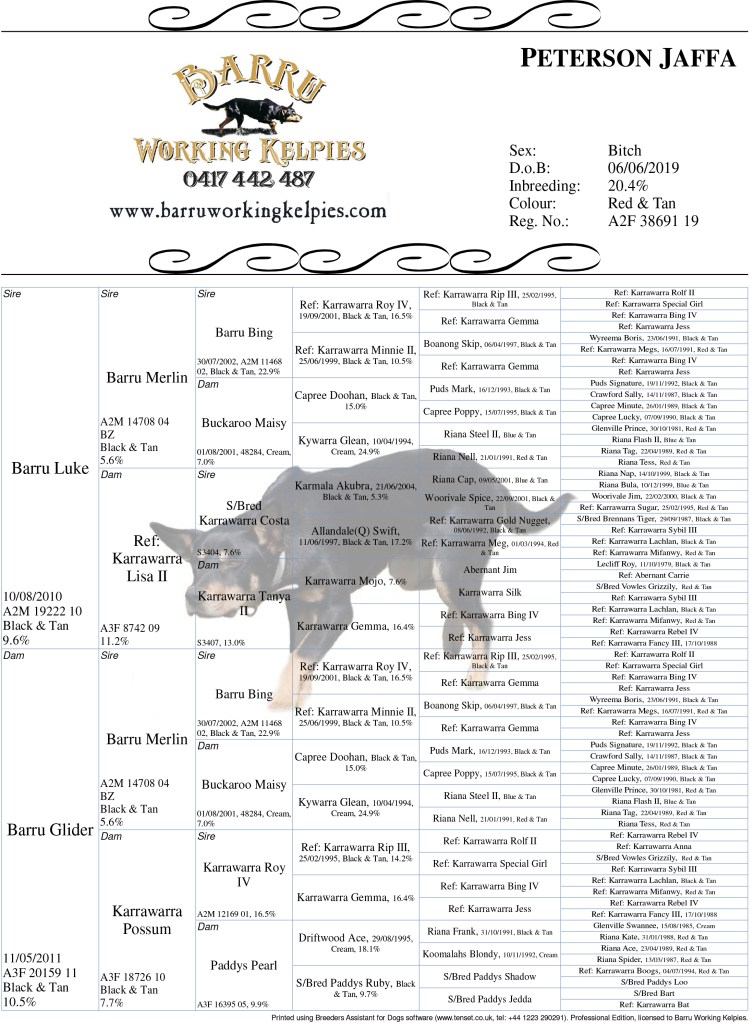 Jaffa represents a double cross of great old Merlin close up, while also having a father, Luke, that has some of the most impressive natural shepherding traits that we have seen. She very much takes after her father Barru Luke, casting wide and pulling up naturally on pressure points of whatever livestock she is working. She is a natural lead dog like Luke and will naturally move onto the front wing of a mob and keep them walking without turning the lead. She drives nicely once called back from the front and shows a lot of heart to shift argumentative stock. Her progeny are already proving themselves through the country on large holdings.