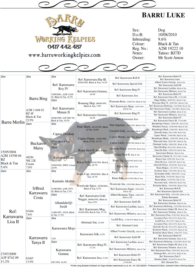 Luke is the biggest casting dog in our camp and has passed that trait on to so many of his progeny both Barru and outside bitches. Tony Parsons saw him work when he was only about 12 months old and said “He was rare in that he had exceptionally wide break – break-on-break. You can’t train that into them. They need to be born with it” were Tony’s remarks.