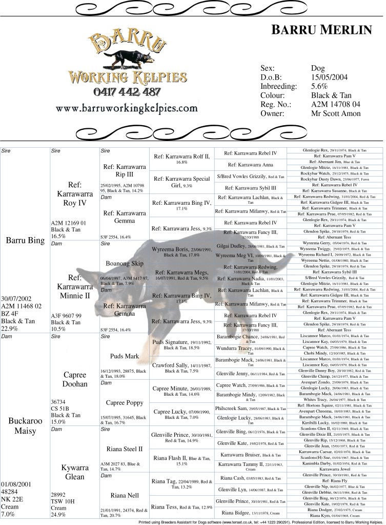 Merlin was an exceptional dog in working ability, temperament and intelligence. He worked all stock with a great deal of style, calmness and confidence. A dog with inherent presence along with good break, cover and nice arcing cast. Merlin worked all manner of livestock from feral goats to mobs of 300 or so merino and crossbred sheep. His primary role was educating weaner and adult beef cattle of many breeds.
