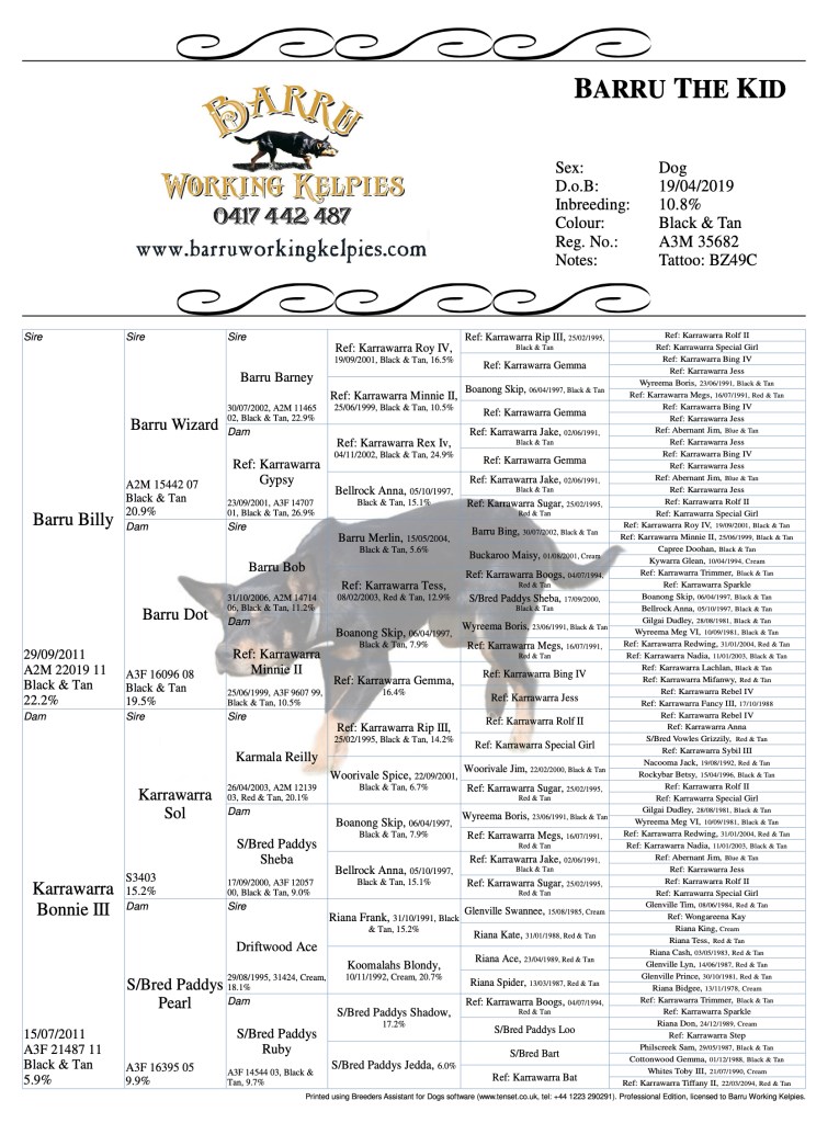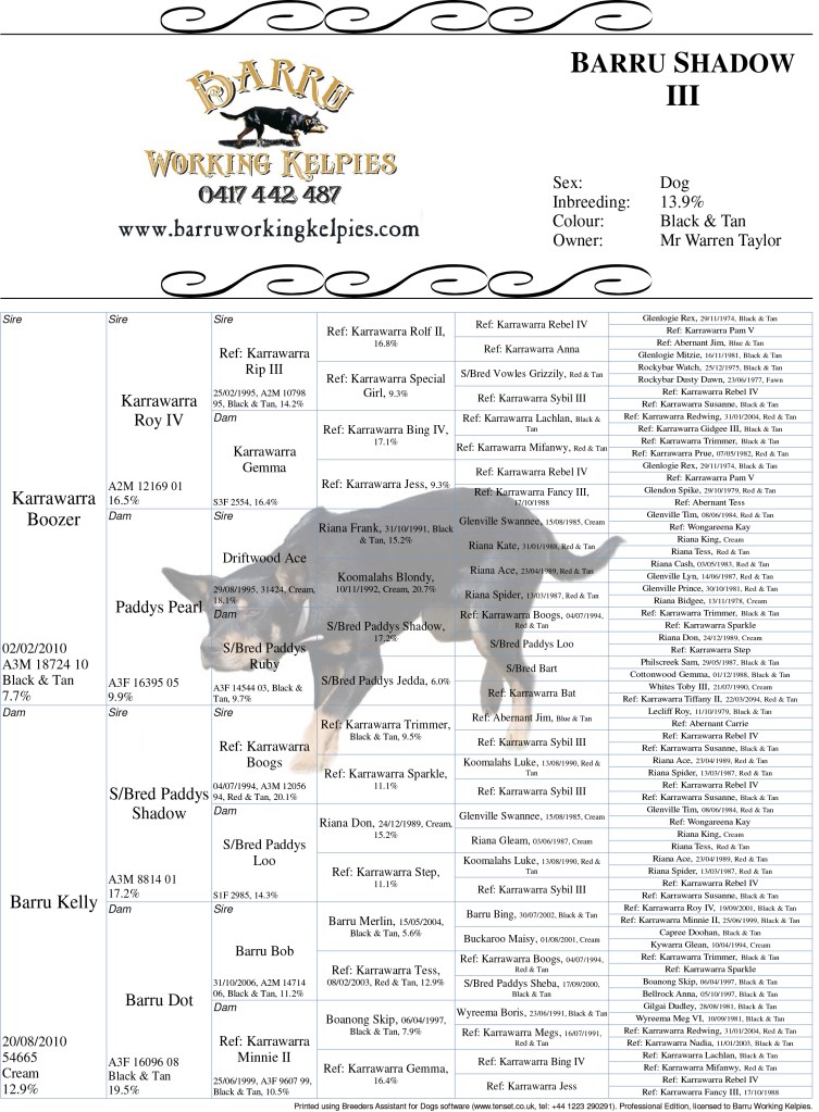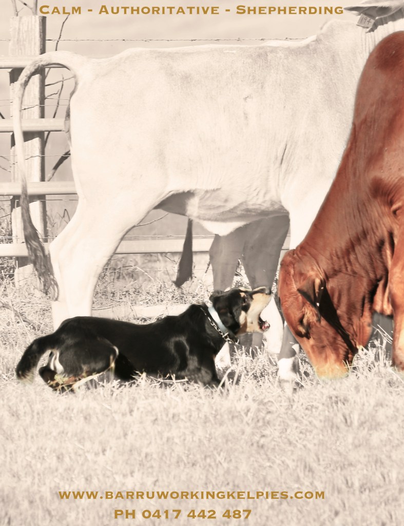 Barru Shadow is a proven work and trial dog at a relatively young age. He is consistently holding his own with the best trial cattle dogs in the country (see trial achievements below) and is just as comfortable at home bringing a few hundred dairy cows in for milking. He has done a lot of educating of both young and old cattle and is regularly blind cast in the dark and left to his own devises to gather and direct cattle while his owner Warren moves electric fences. The milkers need to be taken across a tidal river and if Shadow and the cows beat Warren there, he can be seen working them in the water like a black and tan crocodile. He is cool under the pressure of a cow with newborn calf and will begin to force with a gentle style of nose bite to initiate movement and has the uncanny ability to gradually step the intensity of his bite up quite a few notches if required. Dogs like Shadow aren’t born every day.