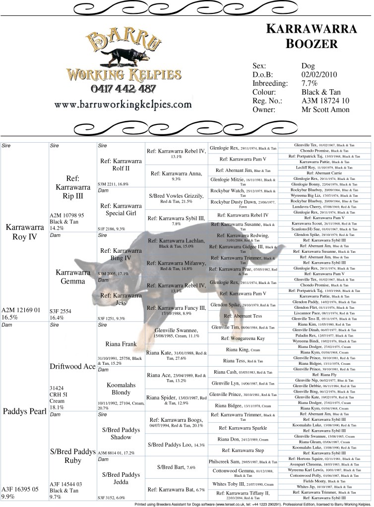 Boozer had natural cast, arc and distance off his stock at an early age. He was able to contain his stock with absolute minimal movement. There is video on this website of him at 8 months of age on flighty lambs, not moving an inch further than he has to. He also has the ‘drive and hold’ traits so hard to find in a dog, that allow him to maintain control of runny stock from behind. He is a true shepherding dog that will freely back a race. He is a good calf and dry cattle worker also. Tremendous big-boned type with broad head to match. A proven sire of so many Barru pups which he produced from 10 months of age.